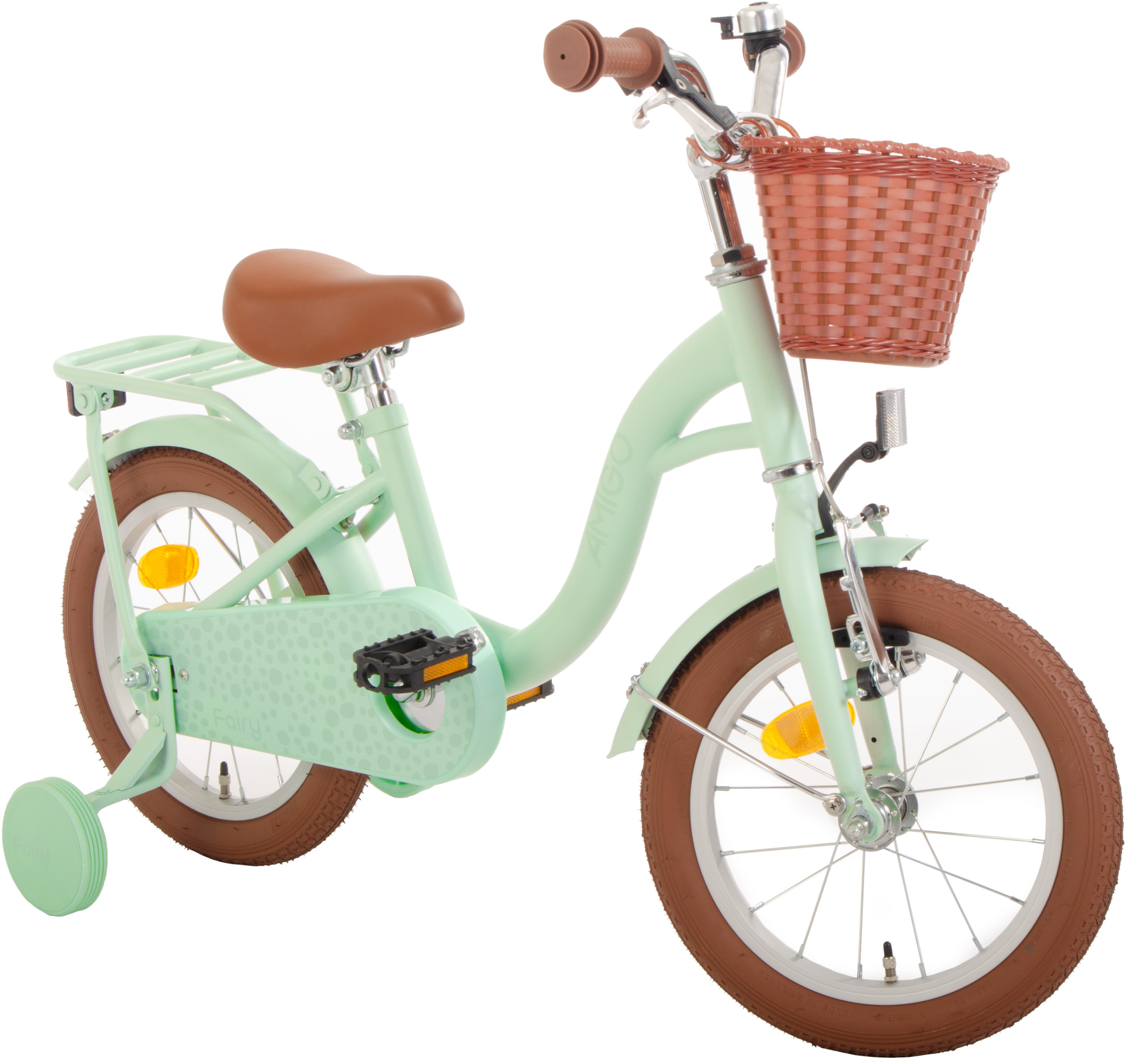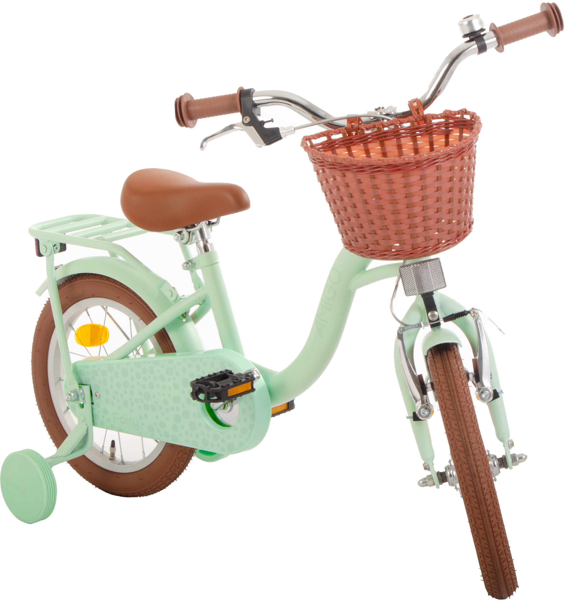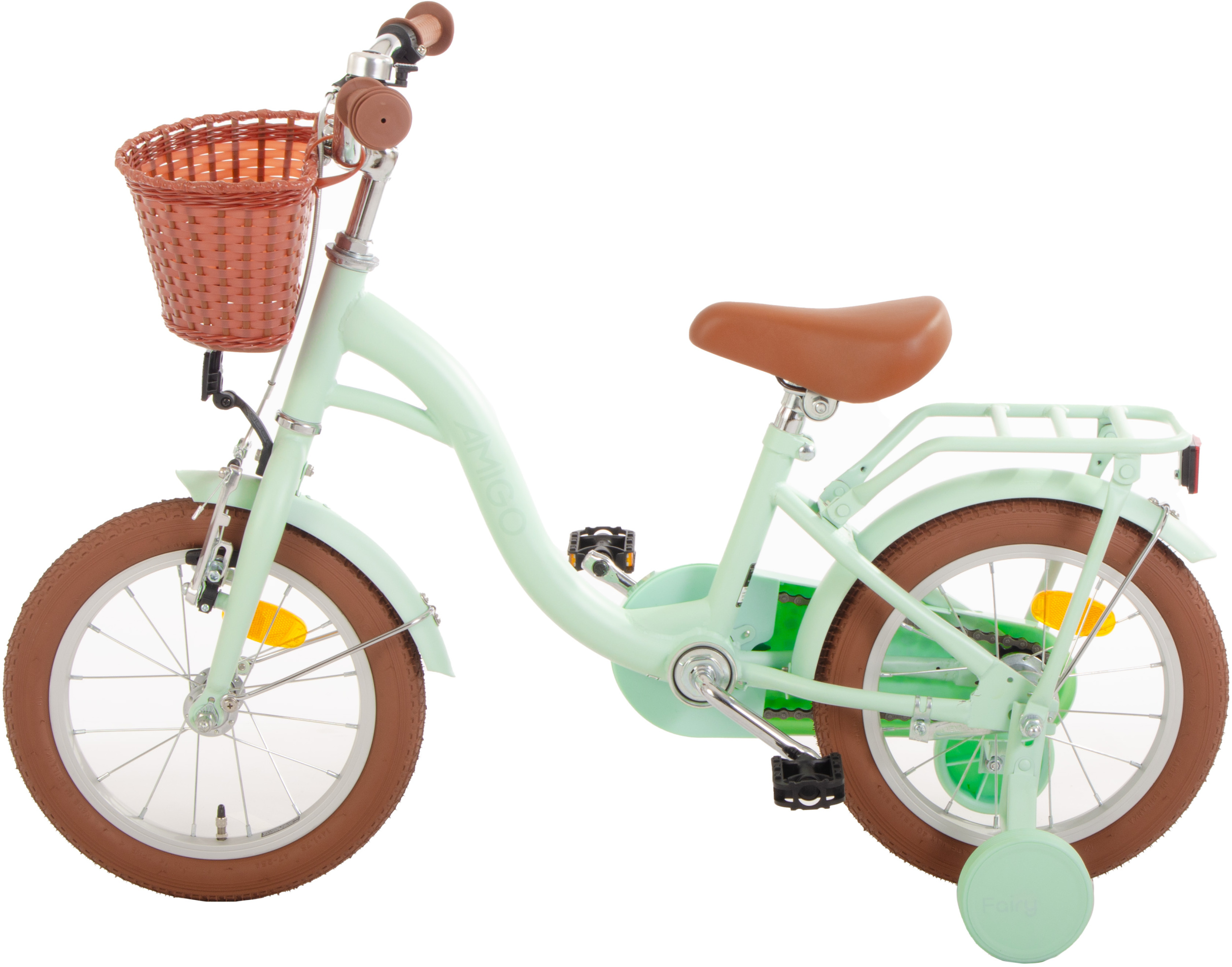 Laat je betoveren door het magische karakter van de AMIGO Fairy! Deze 14 inch kinderfiets heeft een prachtige mintgroene pastelkleur én een sprookjesachtige print op de kettingkast. De bruine handvatten, het zadel en de banden geven een leuke twist aan het geheel. Maar ook het frame is uniek dankzij de enkele bovenbuis. De meisjesfiets heeft naast een bagagedrager ook een fietsmand. Speciaal voor al jouw (school)spullen of een gezellige picknick! Al wat verder gevorderd met oefenen? Probeer dan eens een rondje zonder de zijwielen.
